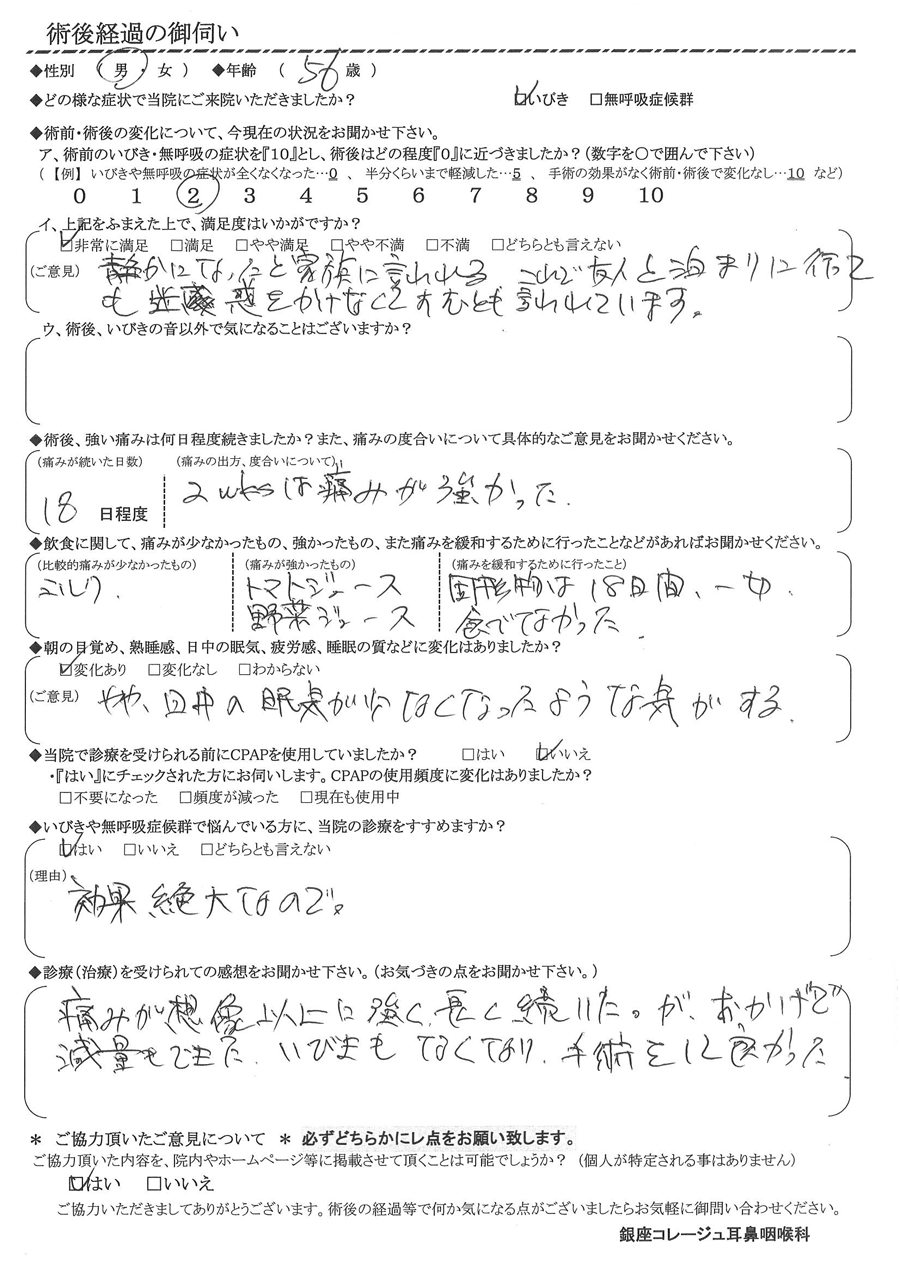 A: 痛みが想像以上に強く、長く続いた。が、お陰で減量もできた。いびきも無くなり、手術をして良かった。