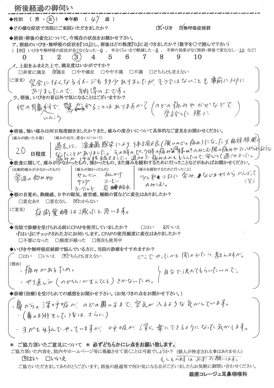ア, 術前のいびき・無呼吸の症状を『10』だったとすると、術後はどの程度になりましたか? 【3】