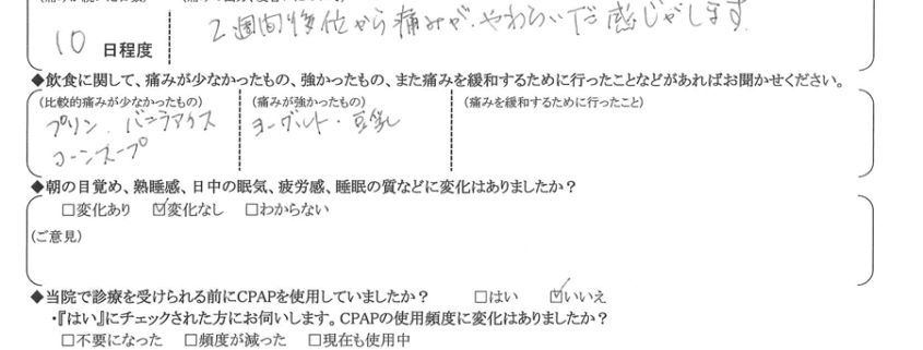 (痛みの程度について) 2週間後位から痛みが和らいだ感じがします。