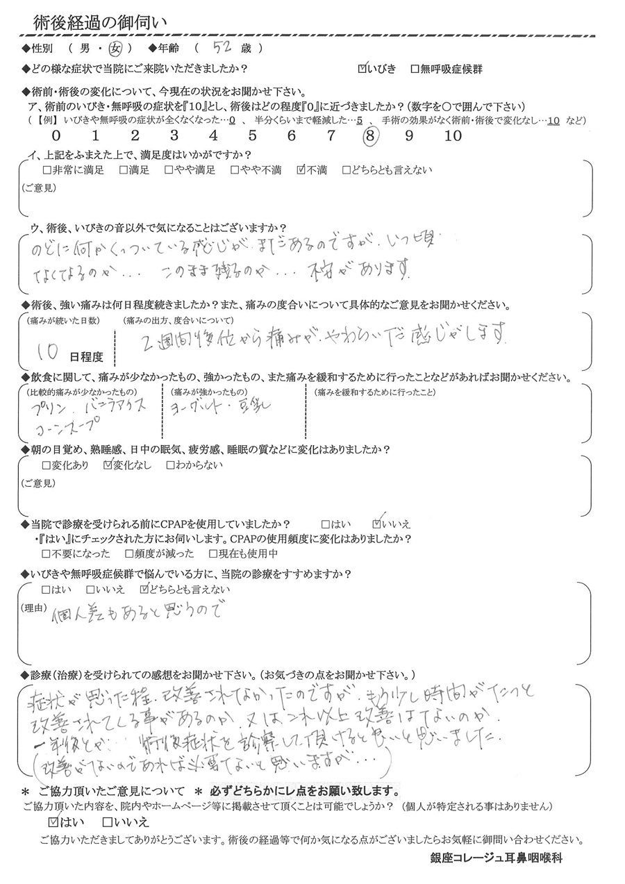 ア, 術前のいびき・無呼吸の症状を『10』だったとすると、術後はどの程度になりましたか? 【8】