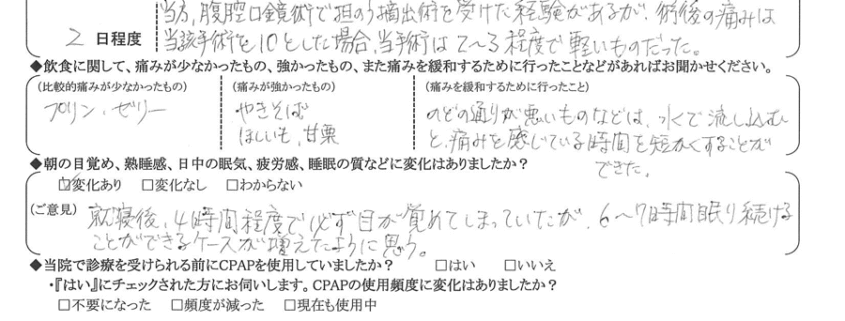 (ご意見) 幾分、睡眠の質が良化し、日中の眠気が少なくなったと思う。