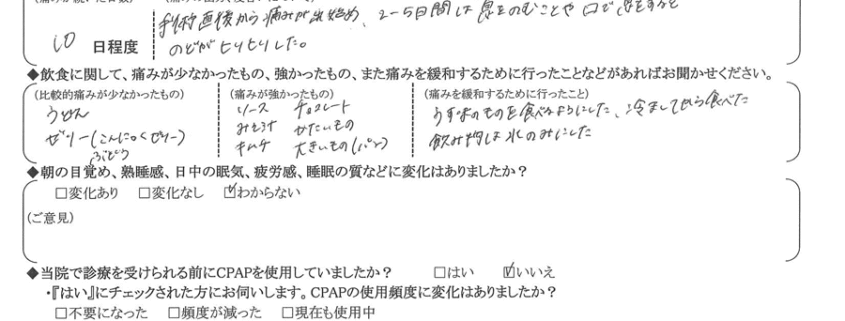 (痛みの程度について) 手術直後から痛みが出始め、2~5日間は息(唾)を飲む事や口で息をすると喉がヒリヒリした。