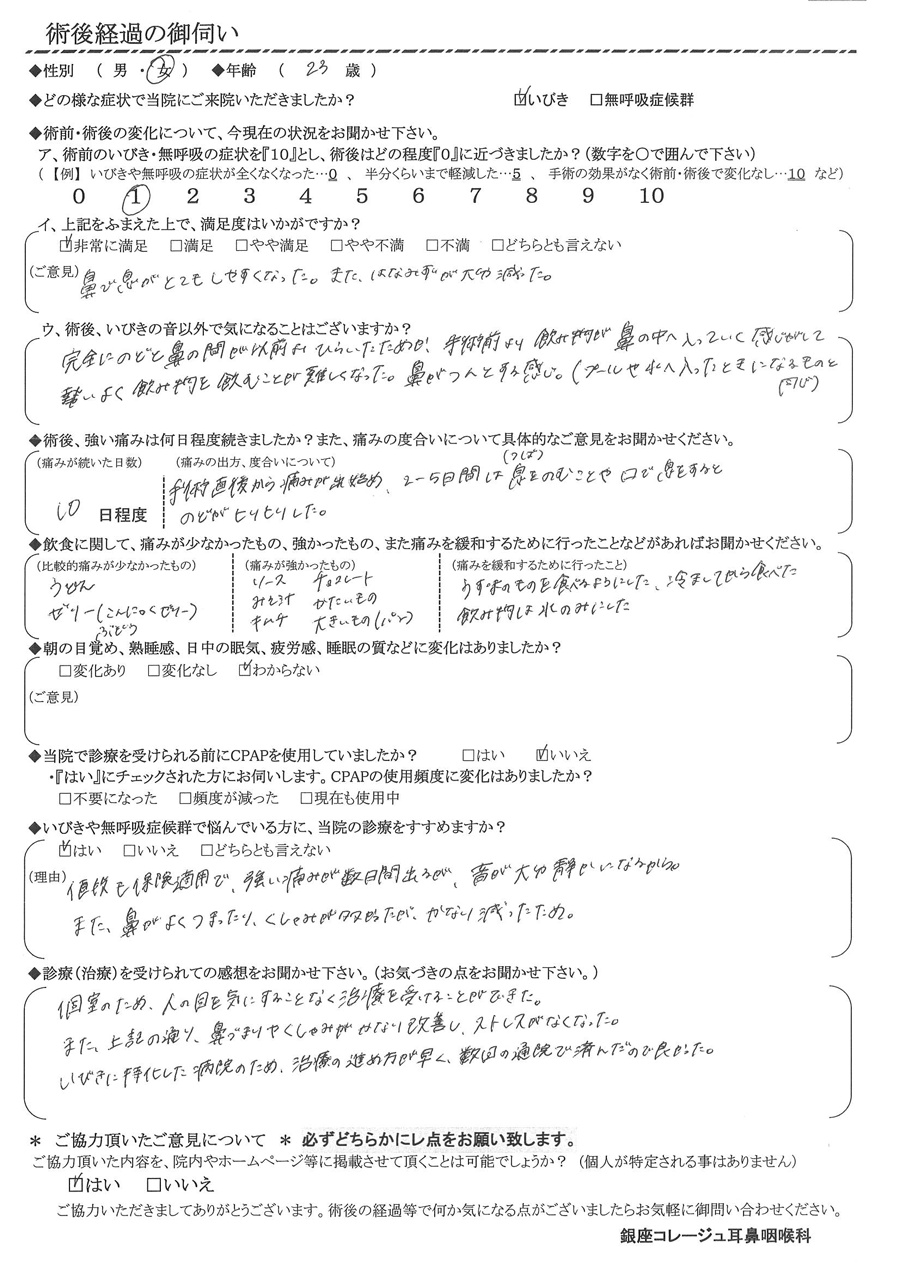A: 個室の為、人の目を気にすることなく治療を受ける事ができた。また、上記の通り鼻詰まりやくしゃみがかなり改善し、ストレスが無くなった。いびきに特化した病院の為、治療の進め方が早く、数回の通院で済んだので良かった。