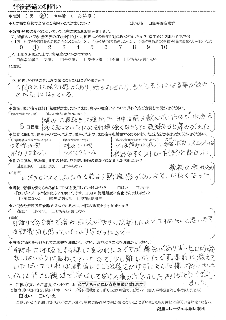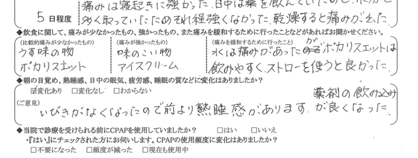 (ご意見)  いびきが無くなったので、前より熟睡感があります。薬剤の飲み込みが良くなった。