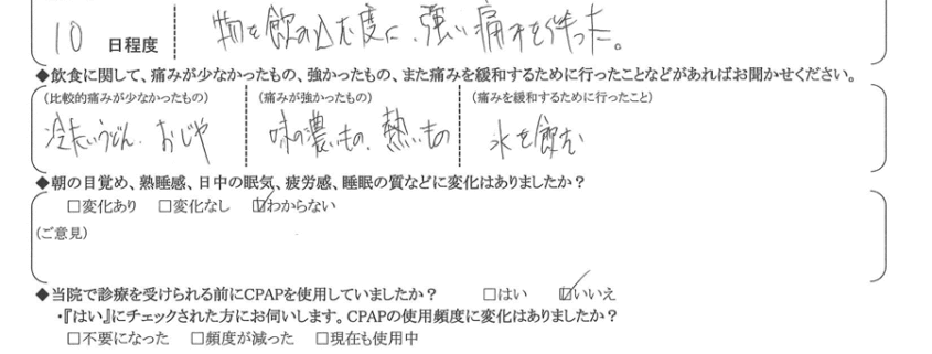 (痛みの程度について) 物を飲み気む度に、強い痛みを伴った。