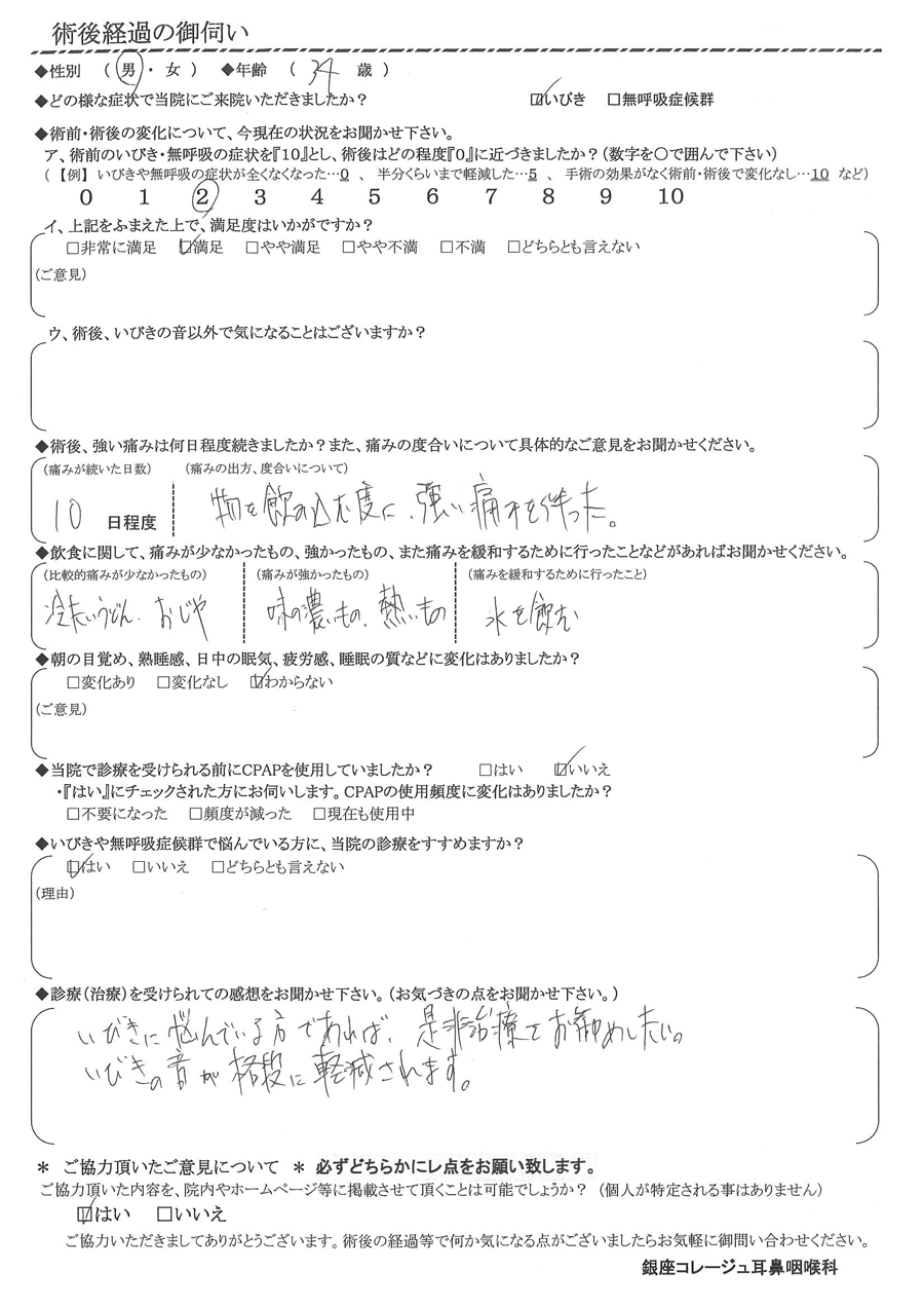 A: いびきに悩んでいる方でれば、是非治療をお勧めしたい。いびきの音が格段に軽減されます。