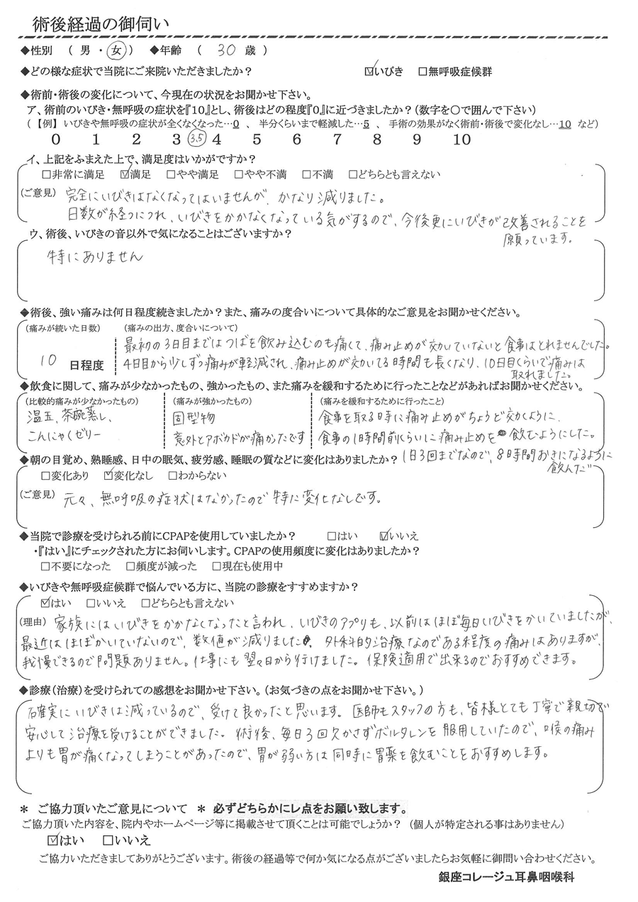 A: 確実にいびきは減っているので、受けて良かったと思います。医師もスッタフの方も皆様とても丁寧で親切で安心して治療を受けることができました。術後、毎日3回欠かさずボルタレンを服用していたので、喉の痛みよりも胃が痛くなってしまうことがあったので、胃が弱い方は同時に胃薬を飲む事をオススメします。