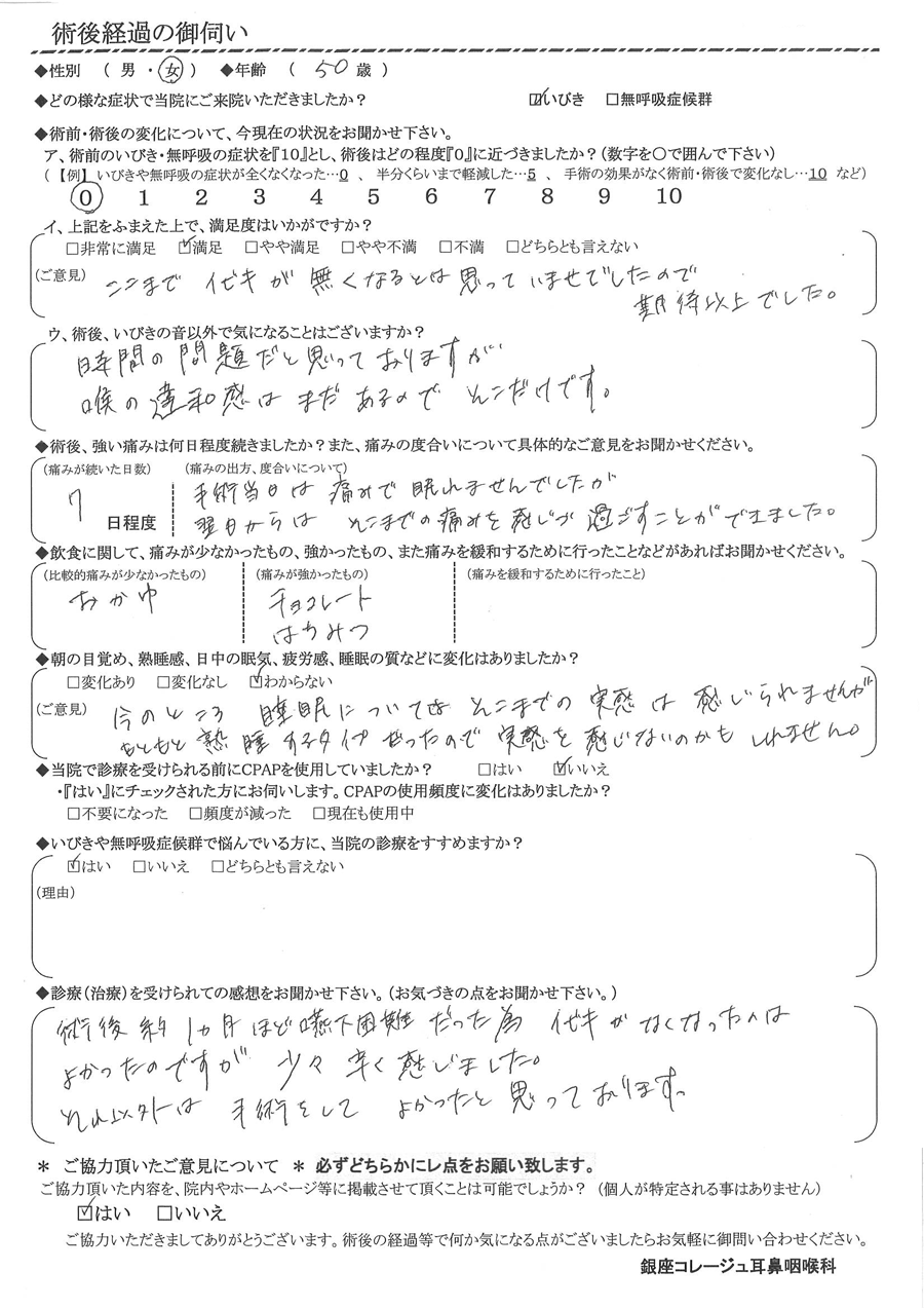 A: 術後約1ヶ月程、嚥下困難だった為イビキがなくなったのは良かったですが、少々辛く感じました。