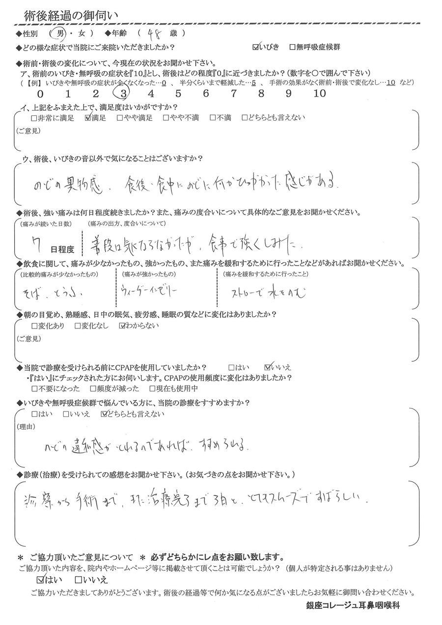 ア, 術前のいびき・無呼吸の症状を『10』だったとすると、術後はどの程度になりましたか? 【3】