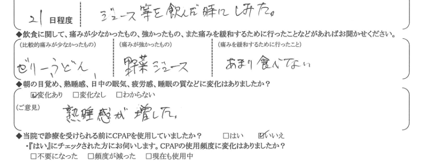 (痛みの程度について) ジュース等を飲んだ時にしみた。