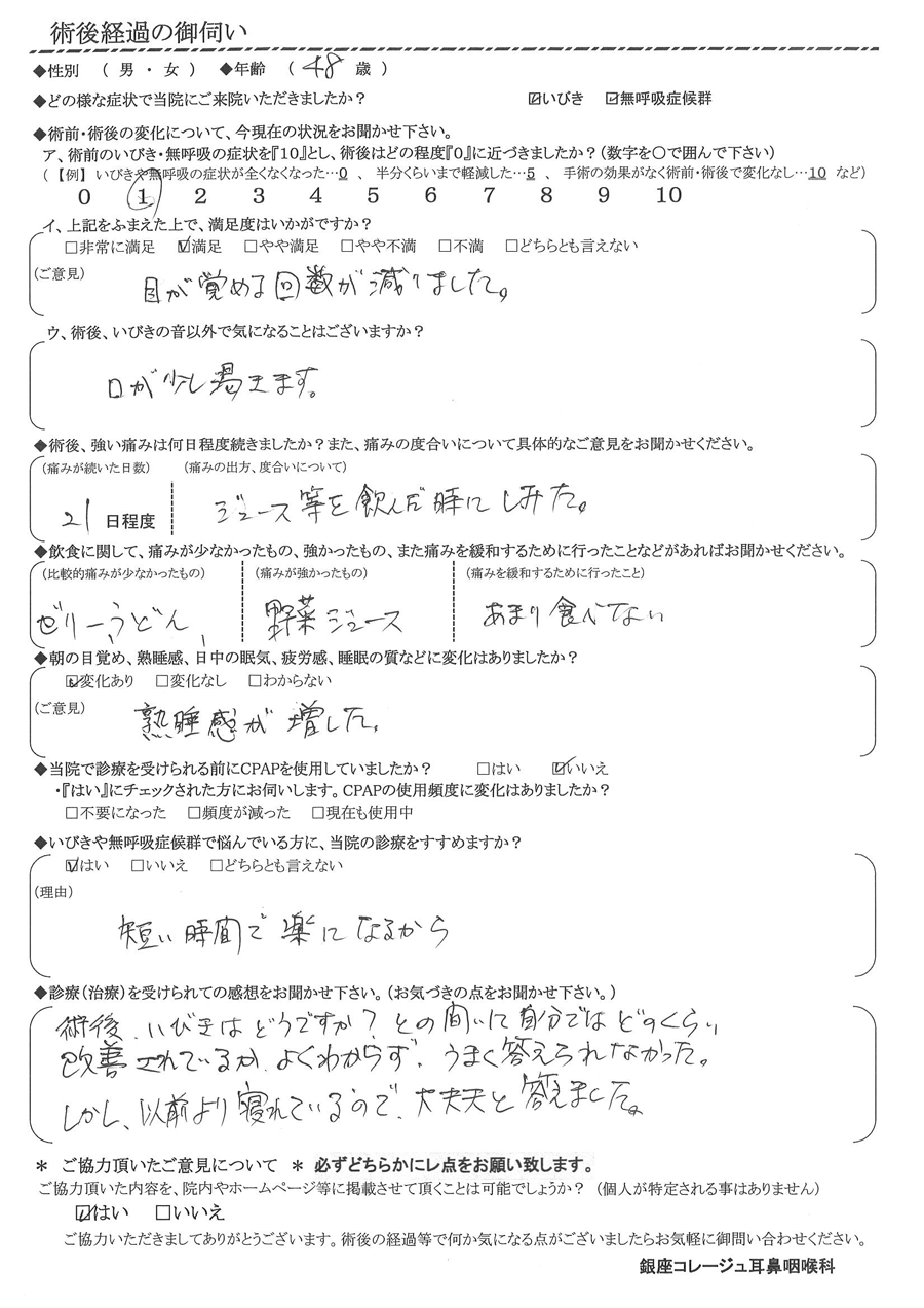 A: 術後、いびきはどうですか?との問いに、自分ではどのくらい改善されているかよく分からず、上手く答えられなかった。しかし、以前よりは寝ているので大丈夫と答えました。