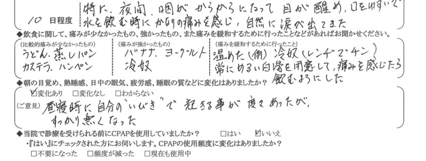 (痛みの程度について) 特に夜間、喉がカラカラになって目が覚め、口をゆすいで水を飲む時にかなりの痛みを感じ、自然に涙が出てきた。