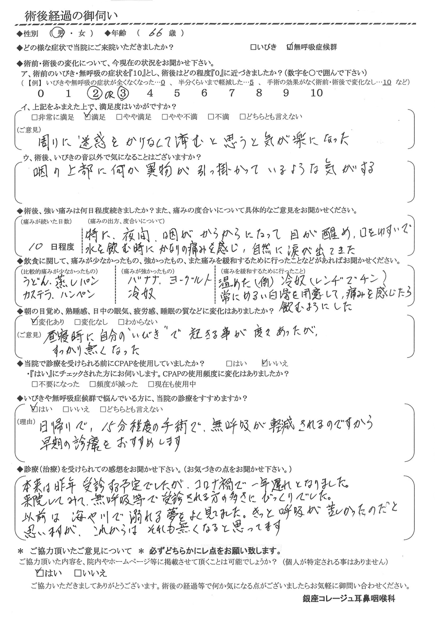 A: 本来は昨年受診する予定でしたが、コロナ禍で一年遅れとなりました。来院してみて、無呼吸等で受診される方の多さにビックリでした。以前は、海や川で溺れる夢をよく見ました。きっと、呼吸が苦しかったのだと思いますが、これからはそれも無くなると思ってます。
