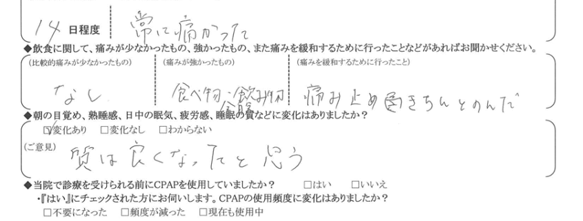 Q.術後、強い痛みは何日程度続きましたか?また、痛みの度合いについて具体的なご意見をお聞かせください。