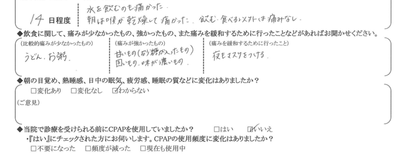 (痛みの程度について) 水を飲むのも痛かった。朝は喉が乾燥して痛かった。飲む・食べる以外は痛みなし。