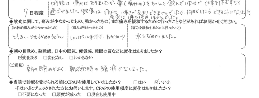 (ご意見) 以前は無呼吸で朝の目覚めも悪かったのですが、術後はスッキリ朝目覚める事ができます。