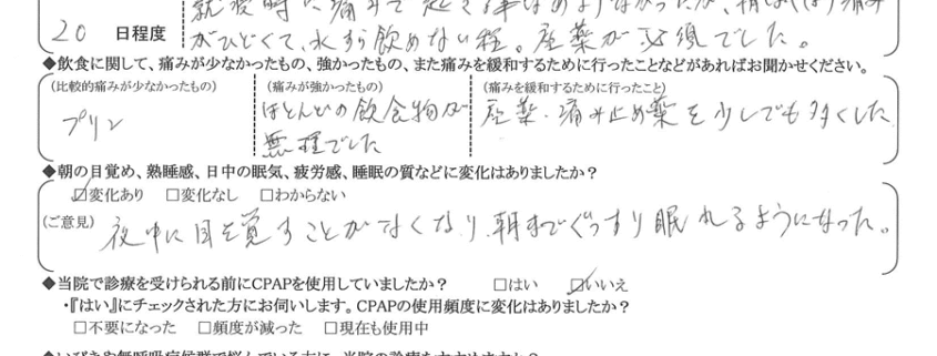(痛みの程度について) 就寝時に痛みで起きることはあまり無かったが、朝はやはり痛みが酷くて水すら飲めない程。