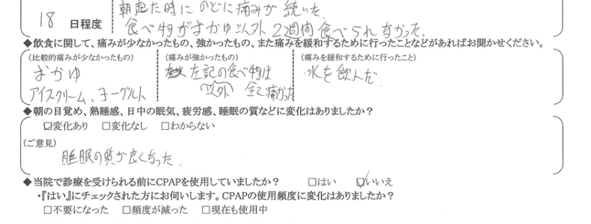 (痛みの程度について) 朝起きた時に喉に痛みが続いた。食べ物がおかゆ以外2週間食べられなかった。