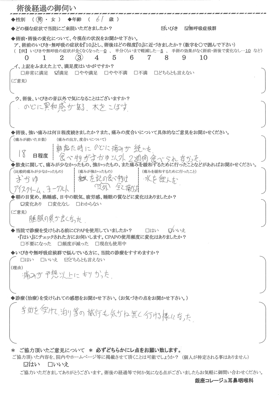 ア, 術前のいびき・無呼吸の症状を『10』だったとすると、術後はどの程度になりましたか? 【3】