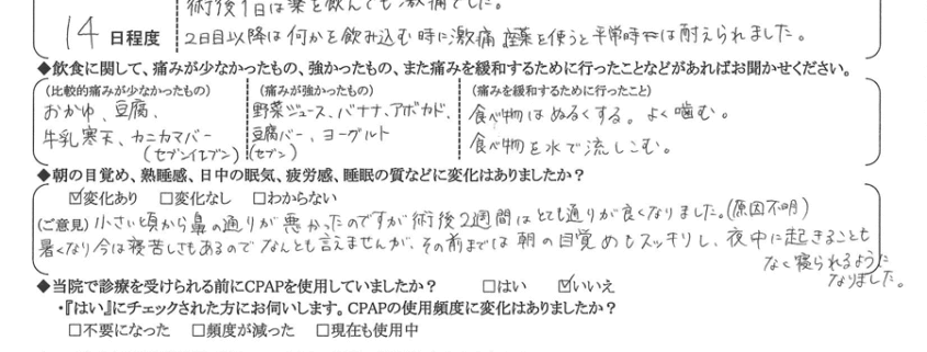 (ご意見) 手術を受ける前まで「いびきラボ」というアプリで平均スコア35超えでしたが、今は5~10に減少しました。