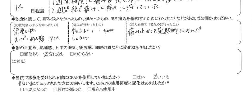 (痛みの程度について) 1週間程度は痛みが強く、水を飲むのも痛みが伴った。2週間程で痛みは徐々に減っていった。