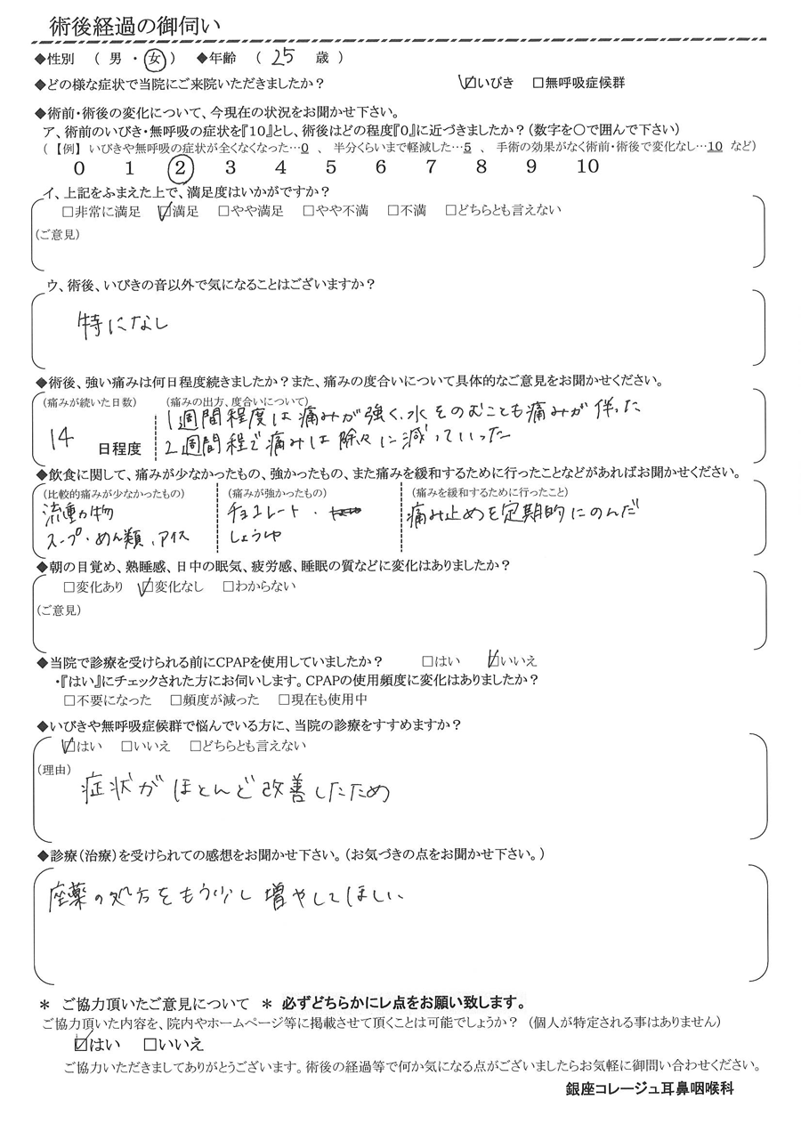 ア, 術前のいびき・無呼吸の症状を『10』だったとすると、術後はどの程度になりましたか? 【2】