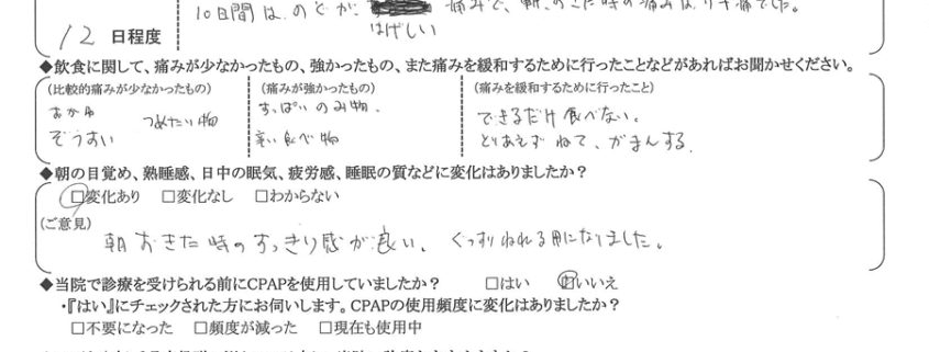 (ご意見) こんなにいびきと無呼吸が良くなるとは、思っていた以上でした。(もっと早く手術すれば良かったと思います。)