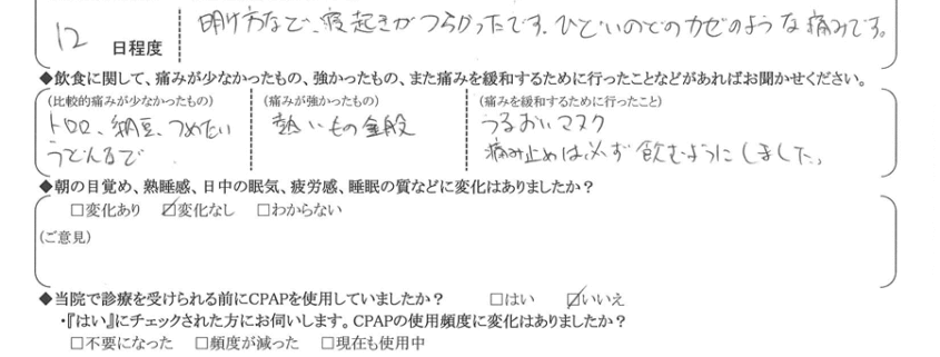 (痛みの程度について) 明け方など、寝起きが辛かったです。酷い喉の風邪の様な痛みです。
