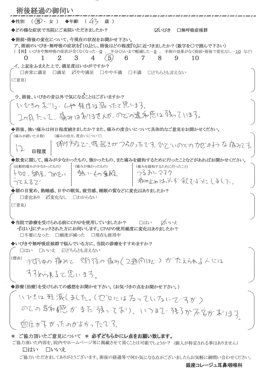 A: いびきは減少しました。(ゼロにはなっていないですが) 喉の違和感がまだ残っており、いつまで残るか不安があります。血圧が下がったのが良かったです。