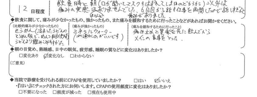 (痛みの程度について) 飲食時と朝(口が開いていてマスクも外れてしまい、喉カラカラ)以外は、痛みの実感はほとんどありませんでした。6日目から話す仕事を再開したので、話し過ぎると痛みがありました。