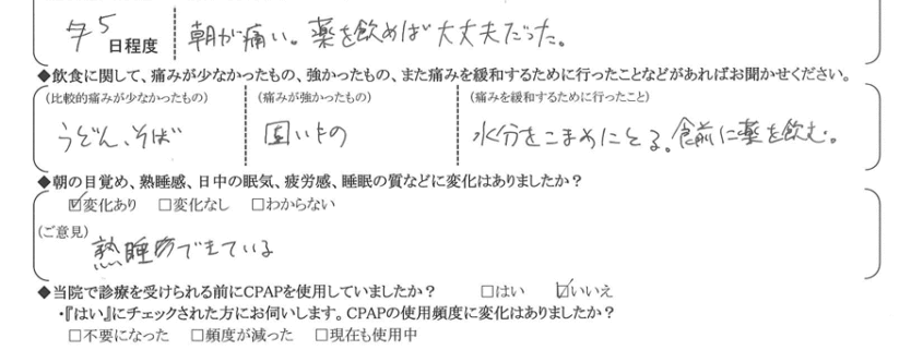 (痛みの程度について) 朝が痛い。薬を飲めば大丈夫だった。