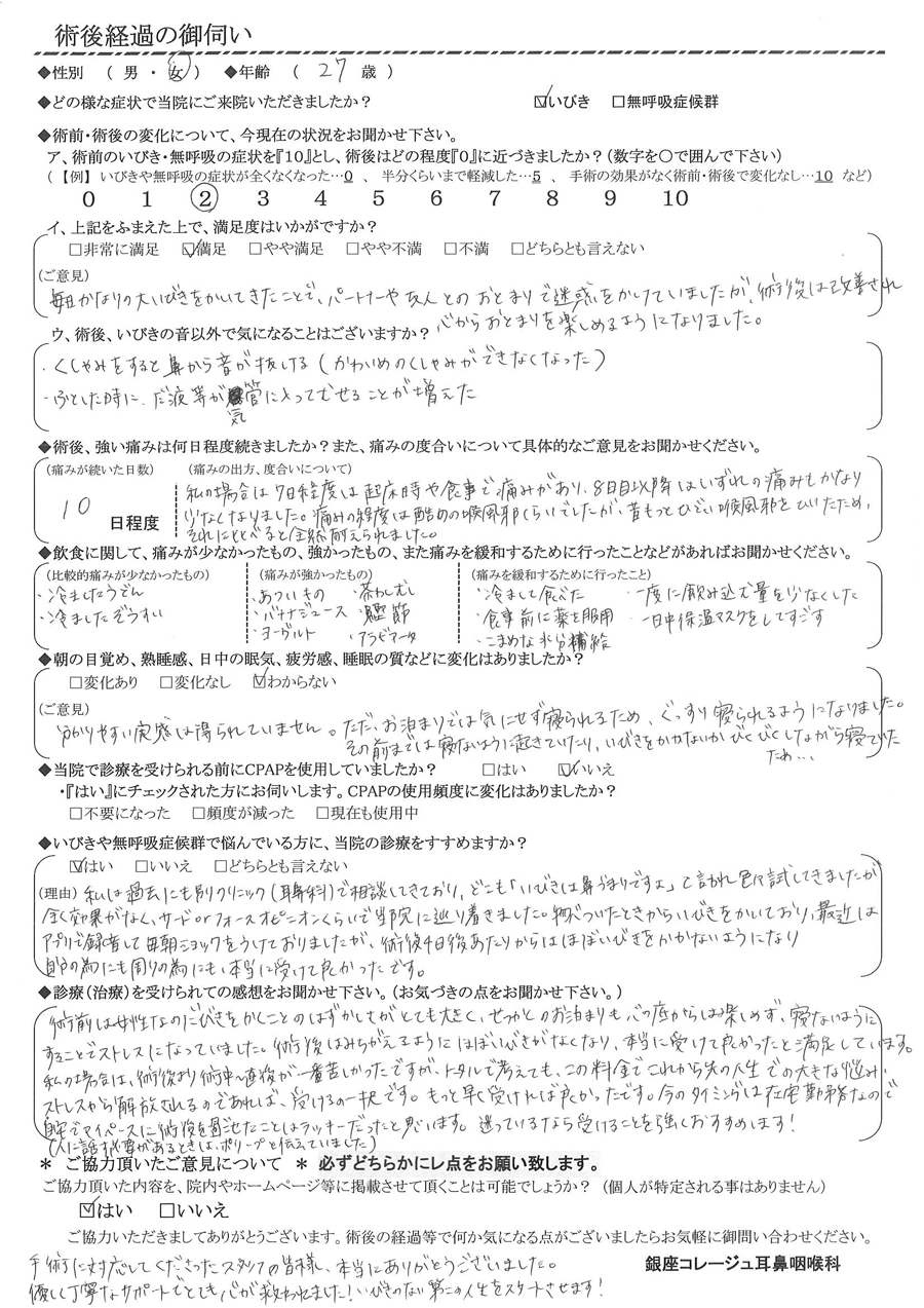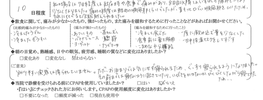 (ご意見) 毎日かなりの大いびきをかいていた事で、パートナーや友人とのお泊りで迷惑をかけていましたが、術後は改善され心からお泊りを楽しめる様になりました。