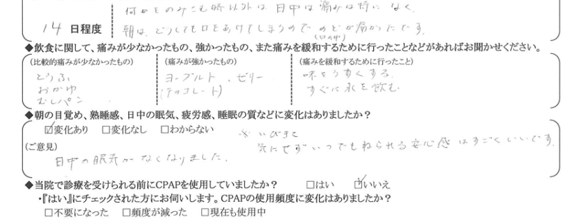 (ご意見) 日中の眠気がなくなりました。 ※いびきを気にせず、いつでも寝られる安心感は凄く良いです。