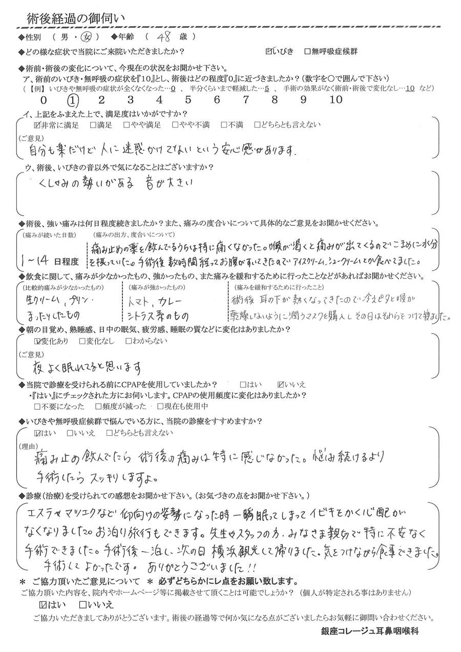 ア, 術前のいびき・無呼吸の症状を『10』だったとすると、術後はどの程度になりましたか? 【1】
