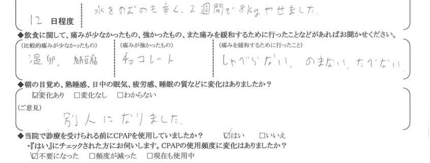 (痛みの程度について) 水を飲むのも辛く、2週間で8㎏痩せました。