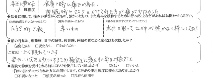 (痛みの程度について) 食事の時に痛みが痛かった。睡眠時にマスクをかけて寝た方が痛みが少なかった。