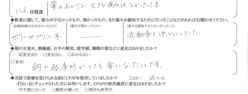 (痛みの程度について) 薬のお陰で、大きな痛みは無かったです。