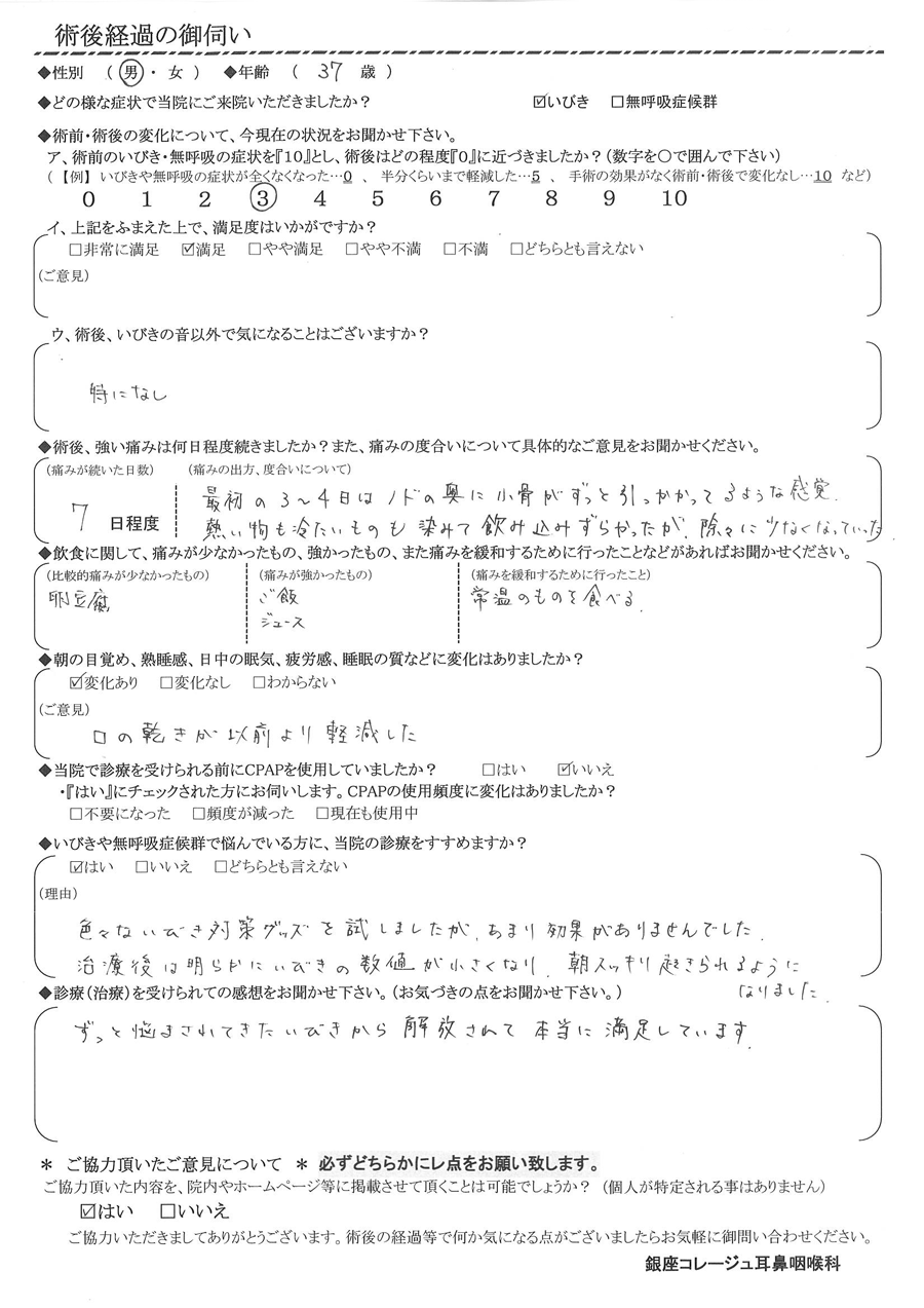 ア, 術前のいびき・無呼吸の症状を『10』だったとすると、術後はどの程度になりましたか? 【3】