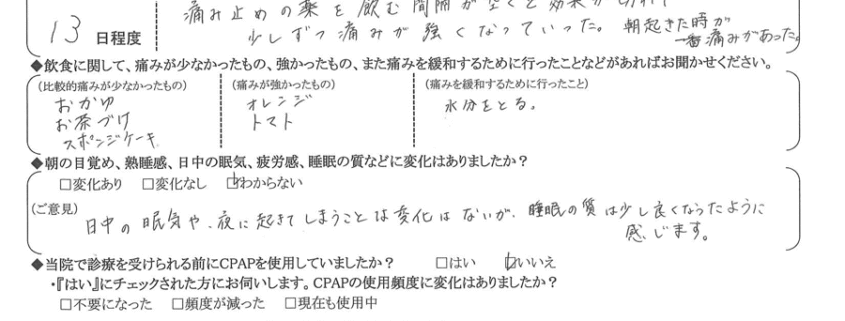 (ご意見) 日中の眠気や、夜に起きてしまう事は変化はないが、睡眠の質は少し良くなった様に感じます。