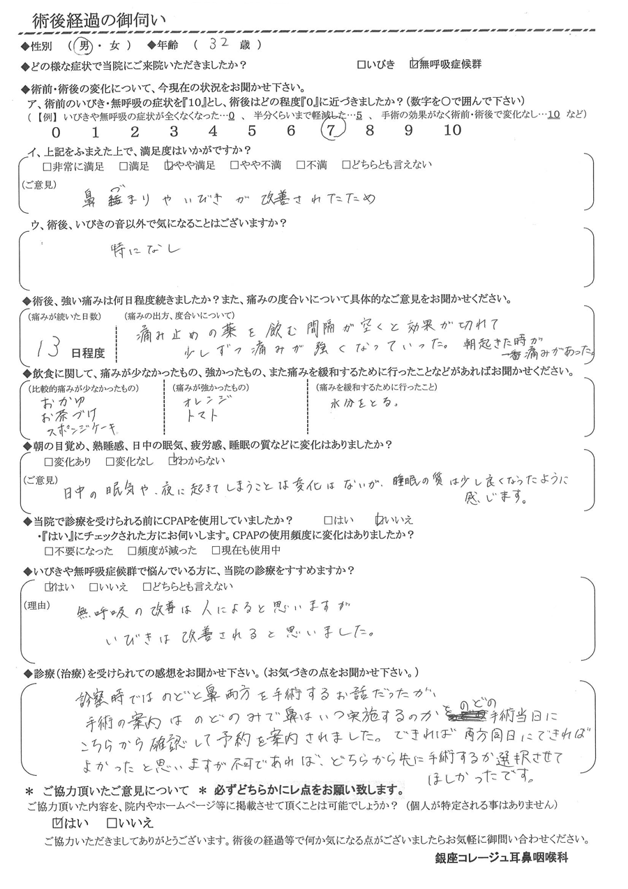 ア, 術前のいびき・無呼吸の症状を『10』だったとすると、術後はどの程度になりましたか? 【7】
