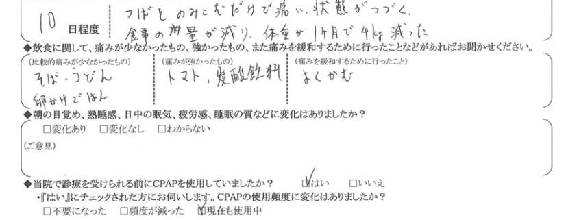 (痛みの程度について) 唾を飲み込むだけで痛い状態が続く。食事の量が減り、体重が1ヶ月で4㎏減った。