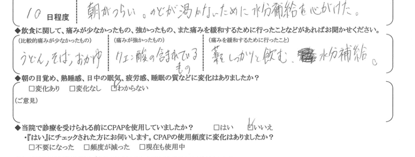 (痛みの程度について) 朝が辛い。喉が渇かない為に、水分補給を心がけた。