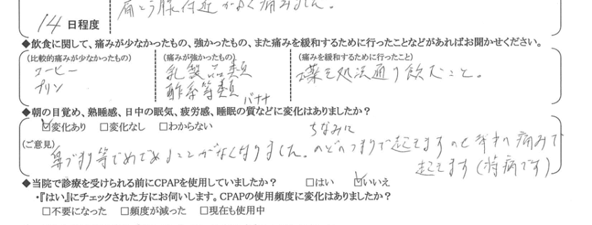 (ご意見) 鼻づまり等で目覚める事がなくなりました。因みに、喉の詰まりで起きますので、背中の痛みで起きます(持病です)