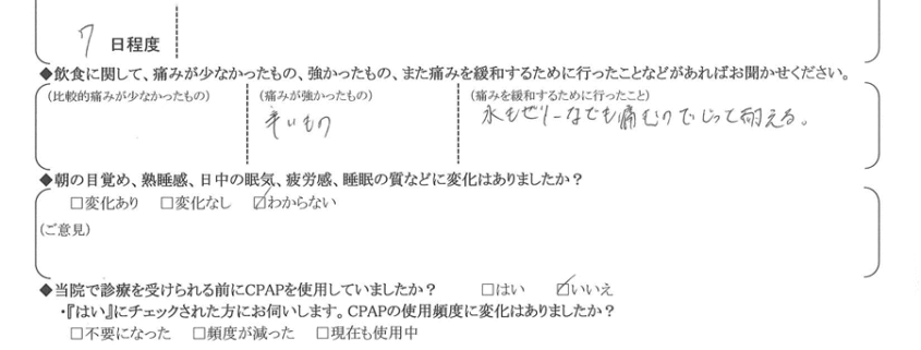 Q.術後、強い痛みは何日程度続きましたか?また、痛みの度合いについて具体的なご意見をお聞かせください。