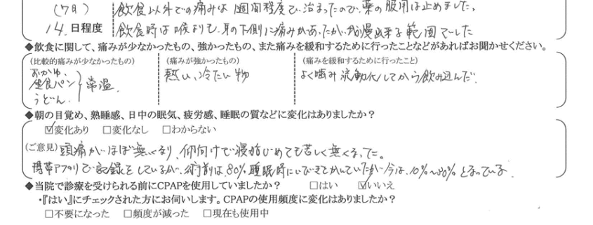 (ご意見) 頭痛がほぼ無くなり、仰向けで寝始めても苦しく無くなった。携帯アプリで記録をしているが、術前は80%睡眠時にイビキをきていたが、今は10~30%となっている。