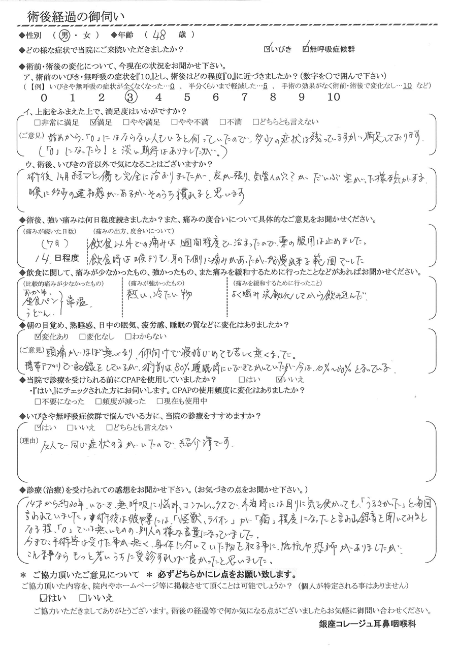 A: 14歳から約30年、イビキ・無呼吸に悩み、コンプレックスで外泊時には周りに気を使っても「うるさかった」と、毎回言われていました。術後は娘や妻には「怪獣・ライオン」が「猫」程度になったと言われ、録音を聞いてみると、なる程、「0」では無いものの別人の様な音量になっていました。今まで手術等は受けた事が無く、身体に付いていた物を取る事に抵抗や恐怖がありましたが、こんな事ならもっと若いうちに受診すれば良かったと思いました。