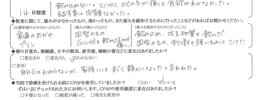 (痛みの程度について) 飲み込めない。とにかく喉の方が痛くて、食欲が湧かなかった。話す事は問題なかった。