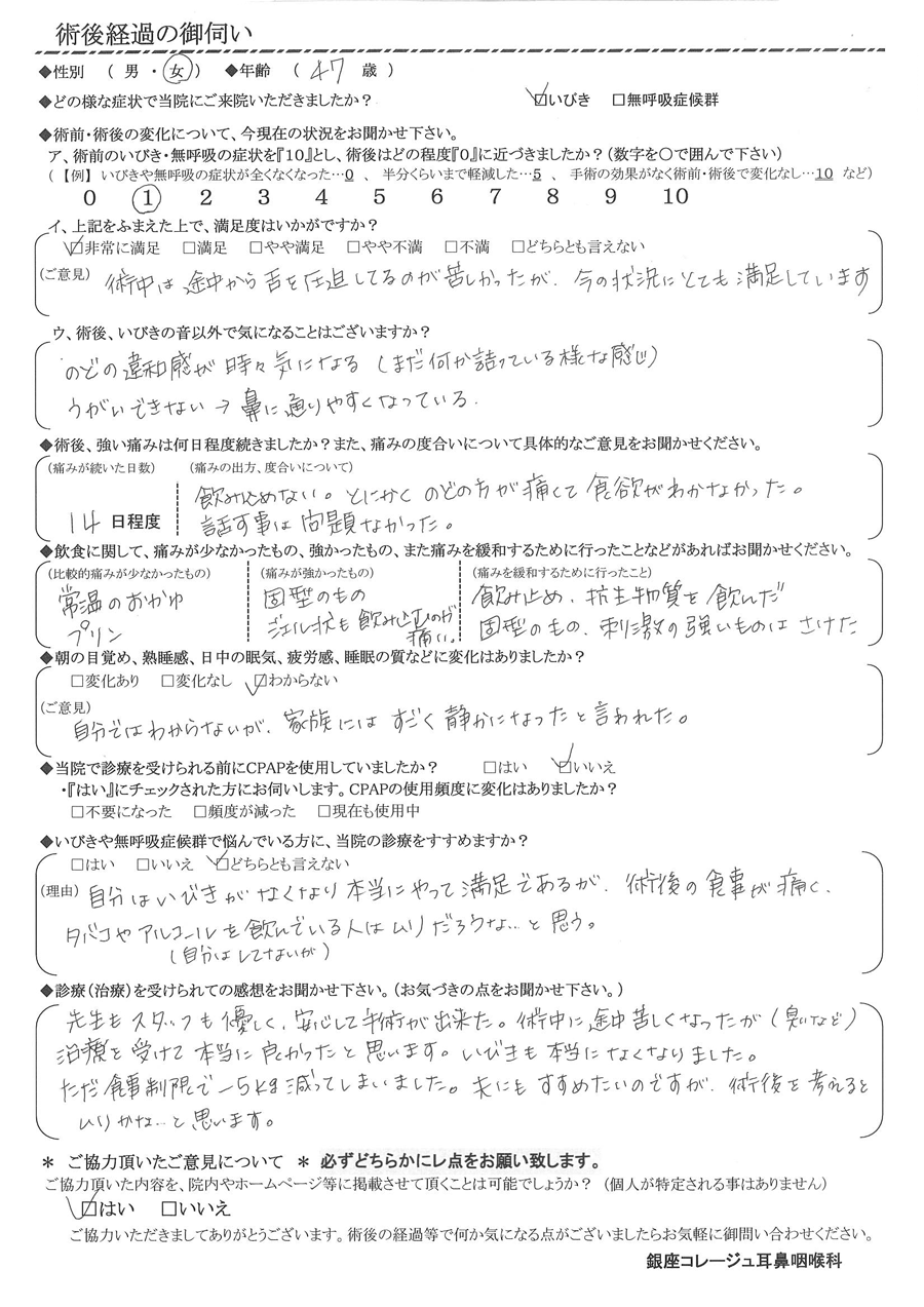 A: 先生もスタッフも優しく、安心して手術が出来た。術中に途中、苦しくなったが(臭いなど)治療を受けて本当に良かったと思います。いびきも本当に無くなりました。ただ、食事制限で-5㎏減ってしまいました。夫にも勧めたいのですが、術後を考えるとムリかな…と思います。