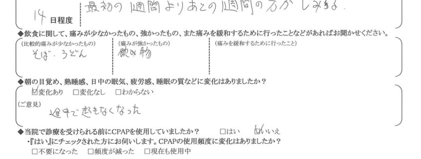 Q.術後、強い痛みは何日程度続きましたか?また、痛みの度合いについて具体的なご意見をお聞かせください。