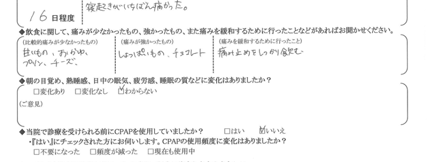 A: 術後は強い痛みがあり、いつまで続くのか心配でしたが、現在は痛みも違和感もない。また、一緒に寝る人に迷惑をかけてしまう心配がなくなり、安心して人と一緒に寝られるようになった。